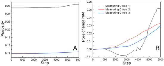 Porosity variations at different locations within the dam were monitored using measuring circles (Figure 16). As shown in Figure 16A, the porosity at Measuring Circle 1 was higher and exhibited greater variation. This is because Measuring Circle 1 is located in the coarse-grained layer, which naturally possesses higher porosity and greater particle size variation. The larger interstitial spaces between coarse particles facilitated the migration of finer particles. In contrast, the fine-grained layer has a higher compaction degree and limited particle movement. Figure 16B demonstrates the degree of porosity variation at different locations. The porosity variation rates in Measuring Circles 2 and 3 were consistent, whereas the variation in Measuring Circle 1 was more pronounced compared to Circles 2 and 3. Specifically, the porosity in Measuring Circle 1 initially decreased before sharply increasing, indicating that particle-scale changes in the coarse-grained layer are more significant during the seepage process.