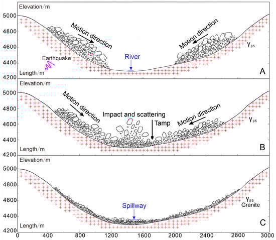 Stability patterns of the Cuona Xuecuo landslide dam. (A)—the stage of headward erosion; (B)—the stage of fluvial scouring; (C)—the stage of dam stability.
