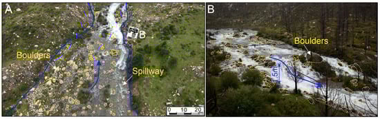 Massive boulders in the spillway of the Conaxue Co landslide dam. (A)—Spillway with distributed massive boulders; (B)—the spillway develops a step-pool system with plunge pools.