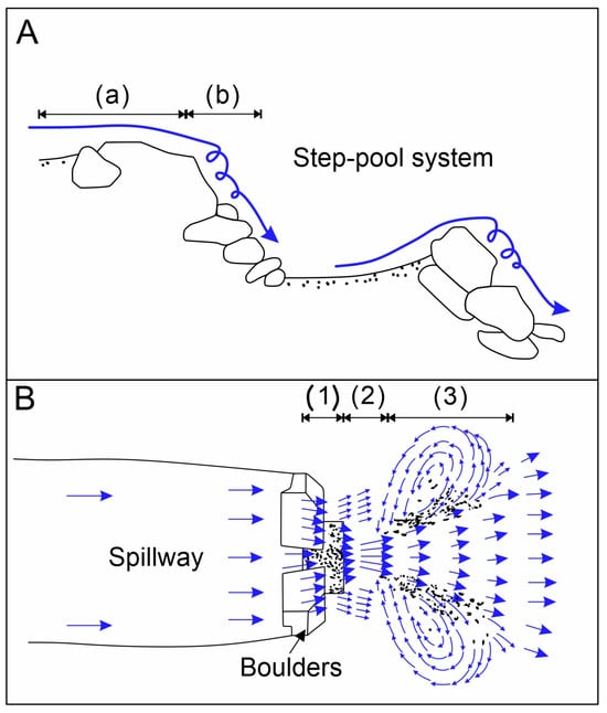 Energy dissipation mechanism of the step-pool system formed in the spillway of the Conaxue Co landslide dam. (A)—Schematic diagram of step-induced energy dissipation mechanism; (B)—schematic diagram of pool-induced energy dissipation mechanism; (1)—main flow zone of hydraulic jump; (2)—interface zone; (3)—large-scale vortex zone.
