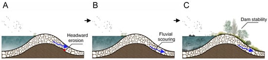 The inverse grading structure (coarser upper and finer basal layers) formed by high-speed long-runout landslides stabilizes the dam. During initial formation, headward erosion occurs in the fine-grained stratum on the downstream slope under hydraulic action, ceasing when its gradient approaches that of the coarse layer (Figure 20A). Continued flow scours relatively finer particles from the coarse downstream layer, inducing particle repositioning until force equilibrium is achieved (Figure 20B). The coarse upper layer resists fluvial erosion, while the partially cemented/dense fine basal layer acts as an aquitard. Progressive stabilization ensues over time (Figure 20C).