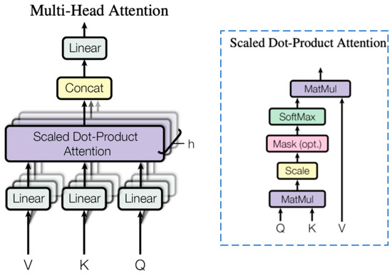 This figure illustrates the multi-head self-attention structure. The left “Scaled Dot-Product Attention” is the basic attention unit, with inputs as Query (Q), Key (K), and Value (V) matrices (all derived from the same sequence data) and outputs as weighted features. “Multi-Head Attention” enhances model representation by concatenating features from multiple parallel attention units (heads); colors (red, blue) distinguish computations of different heads.