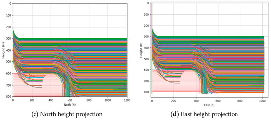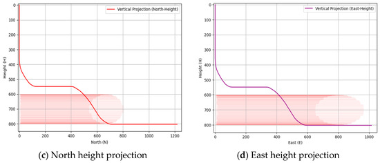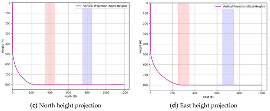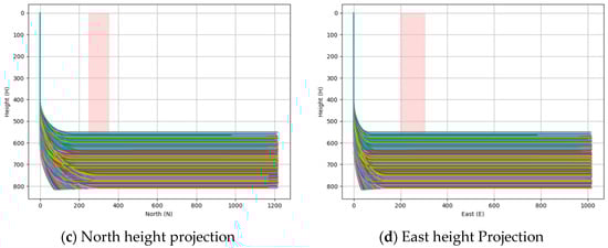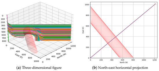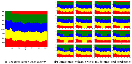 In Figure 4, an added legend (color codes for lithology: red = sandstone, blue = shale, gray = fault zones), coordinates (North–East, in meters), and five profiles are generated to cover different stratigraphic zones. Figure 4 is supplemented. Figure 4a shows the cross-section when East = 0, and Figure 4b shows limestone, volcanic rock, mudstone, and sandstone, from top to bottom.