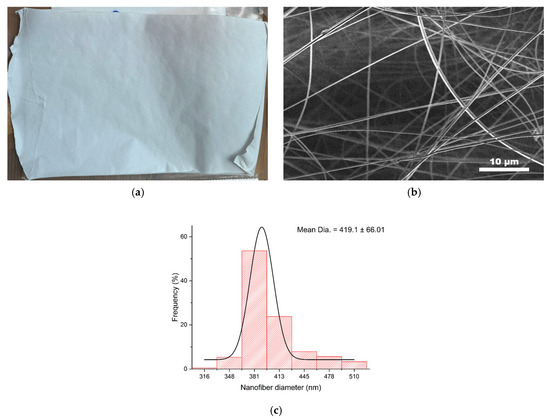 Following electrospinning, the nanofiber mats were dried at room temperature under continuous dehumidification for 72 h to ensure the complete evaporation of residual solvents. Subsequently, they were stored in sealed plastic containers for later use. The electrospun mats exhibited an average thickness of 2.98 ± 0.3 μm, and the surface density was calculated as 50.8 ± 0.22 g/m2 by dividing the total weight of the nanofiber mat (Figure 1a) by its surface area.