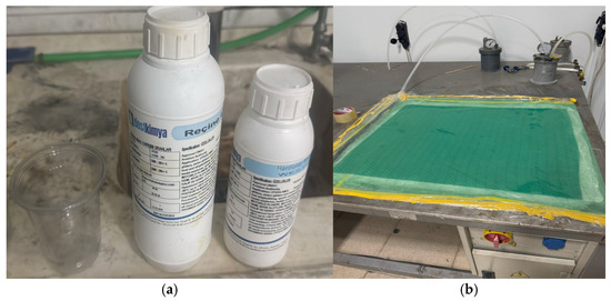 A commercial epoxy resin system (MGS L160/H160) was employed as the matrix and mixed with its corresponding curing agent at a weight ratio of 100:25, in accordance with the manufacturer’s instructions (Figure 2a). For all specimen groups, eight layers of dry E-glass fiber fabric with a [0°/90°] bidirectional orientation were used as the reinforcement [50]. The fabrics were supplied by a commercial distributor (Kompozit.net, Istanbul, Türkiye) and featured a plain weave architecture with a surface density of 200 g/m2 and a thickness of 0.2 mm. Additional properties of the E-glass fibers include a tensile strength of 2 GPa, a Young’s modulus of 80 GPa, a shear modulus of 30 GPa, a density of 2520 kg/m3, a glass transition temperature of 350 °C, a thermal conductivity of 1.2 W/m·K, and a coefficient of thermal expansion of 4.8 × 10−6 K−1.
