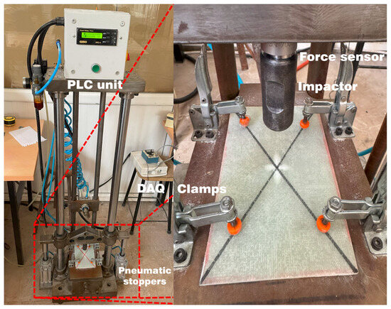 Low-velocity impact tests were performed in accordance with the ASTM D7136 standard using a custom-designed drop-weight impact tower equipped with a hemispherical impactor head of 12 mm diameter and a total mass of 5.6 kg. The specimens were centrally mounted in a rigid steel rectangular fixture and secured with four mechanical clamps to prevent movement during testing. The impactor was released from a height sufficient to achieve an initial velocity of 2 m/s, corresponding to an impact energy of 11 J.