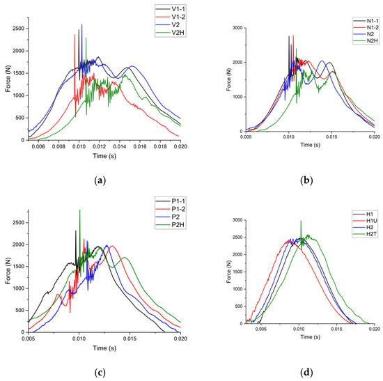 Force-time graphs of (a) virgin (b) nanofiber-layered, (c) PE-modified, and (d) hybrid specimens.