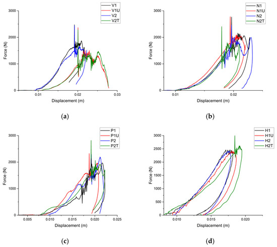 Force-displacement graphs of (a) virgin, (b) nanofiber-layered, (c) PE-modified, (d) and hybrid specimens.