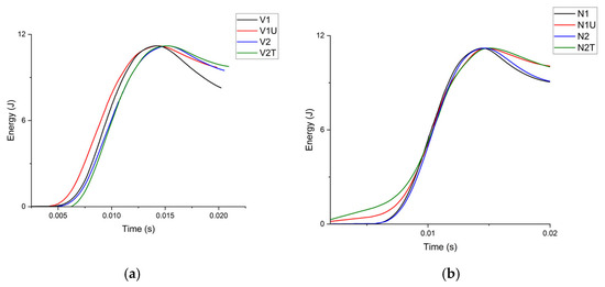 For the virgin specimens (Figure 6a), the absorbed energy curves for the first-impact specimens (V1, V2) exhibit an almost linear increase followed by a plateau, indicating that nearly all of the input energy is absorbed through damage formation and plastic deformation. Upon re-impact (V1U), the curve reaches its peak slightly earlier, implying that the tip rebounds from a now more compliant, damage-weakened target. Thermal conditioning (V2T) shifts the entire trace rightward without increasing the peak value, confirming that heating does not restore structural stiffness but merely delays energy uptake by alleviating residual stresses.