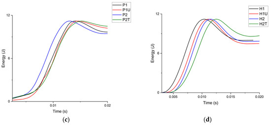 Energy-time graphs of (a) virgin, (b) nanofiber-layered, (c) PE-modified, (d) and hybrid specimens.