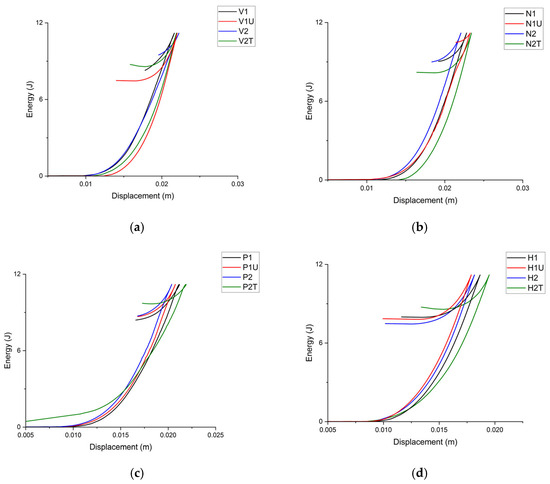 Energy-displacement graphs of (a) virgin, (b) nanofiber-layered, (c) PE-modified, and (d) hybrid specimens.