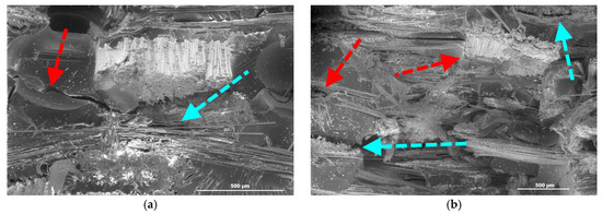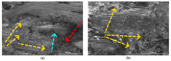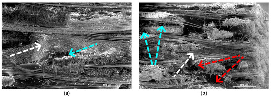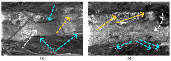 PE-modified (a) untreated and (b) treated specimens (red arrows: matrix cracks, cyan arrows: delaminations, yellow arrows: PE).