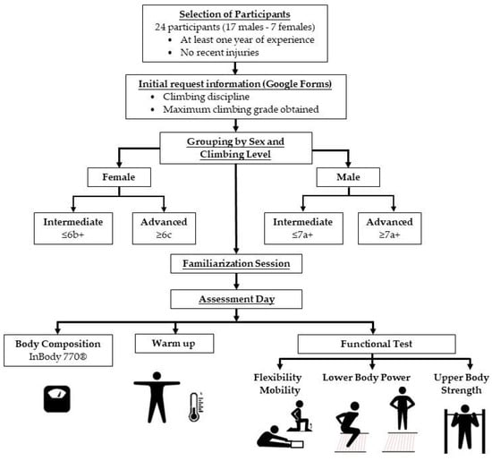 Initially, basic data was collected from Google Forms (pre-designed for this study) to collect basic information about the subjects, such as climbing discipline, maximum climbing grade obtained, and training method. Before the tests, three basic instructions were given: (i) attend after two hours of fasting, (ii) avoid coffee before the tests, and (iii) avoid intense exercise 24 h prior to the tests. The methodology followed in this study, including data collection and testing procedures, is summarized in Figure 1, which shows the methodological flowchart.