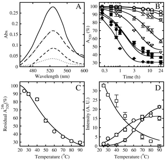 Temperature stability of the burgundy pigment from Pseudofusicoccum adansoniae. (A): absorbance spectra of the crude extract after 24 h of incubation at 25 (solid line), 50 (larger-traced line), 70 (shorter-traced line) and 90 °C (dotted line). (B): isotherms of degradation of the crude extract measured by the decreasing absorbance at 520 nm. Temperatures are 25 (open circles), 30 (open squares), 40 (open diamonds), 50 (triangles up), 60 (triangles down), 70 (closed circles), 80 (closed squares), and 90 °C (closed diamonds). Isotherms were fit into double exponential decay equations (lines) and x axis is in log scale to ease the visualization. (C): residual absorbance at 520 nm of the crude extract after 24 h incubation at the studied temperatures. (D): colorimetric intensity of L* (circles) a* (squares) and b* (diamonds) components of the burgundy pigment present in the crude extract as a function of the 24 h temperature incubation. Lines in (C,D) were drawn merely to guide the eyes. Error bars represent SMD of triplicates.