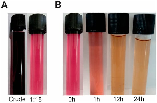 Visual appearance of the burgundy pigment crude extract and dilution of 1:18 (A). Visual changes in thermal degradation at 90 °C (B) at different times.