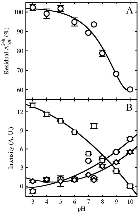 pH stability of the burgundy pigment in the crude extract produced by Pseudofusicoccum adansoniae. Residual absorbance at 520 nm (A), as well as the colorimetric pattern of L* (circles), a* (squares) and b* (diamonds) components at each pH, after 24 h incubation (B). Lines were drawn merely to guide the eyes. Error bars represent SMD of triplicates.