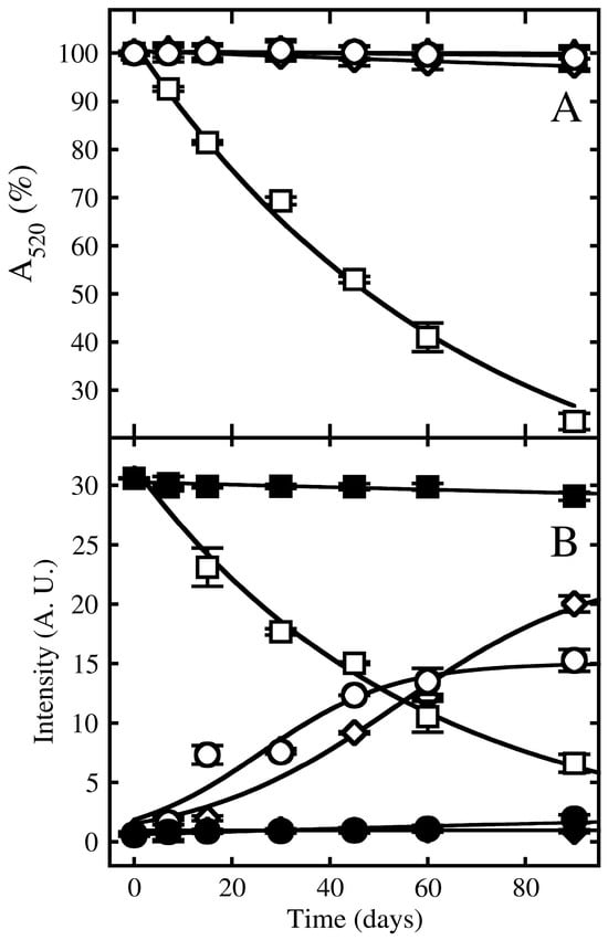 Degradation of the burgundy pigment produced by Pseudofusicoccum adansoniae subjected to storage under light or without light, in a refrigerator and freezer. (A): absorbance at 520 nm of pigment extract samples stored for 90 days without light, both in a freezer (open circles) or refrigerator (open triangles), as well as under a light source in the refrigerator (open squares), as described in Materials and Methods. (B): colorimetric analysis of pigment extract samples stored for 90 days in the refrigerator without light (closed symbols) or under light (open symbols), as described in Materials and Methods. The graph displays the a* (squares), b* (diamonds), and L* (circles) color components for both conditions. Error bars represent triplicate SMD.