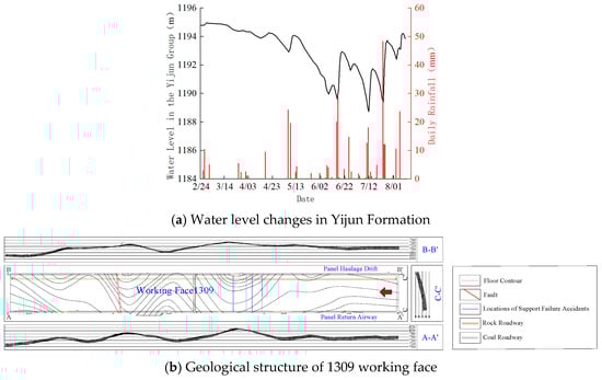 Taking working face 1309 as an example, the working face measures 225 m in length with an advance length of 2339 m, primarily mining the No. 3 coal seam that averages 10.03 m in thickness, 6° in dip angle, and 567.5 m in burial depth, utilizing the fully mechanized top-coal caving method. Figure 1a shows the curve of water level change in the Yijun group: when the water level decreases, it represents the occurrence of sudden water pressure frame accident. Figure 1b shows the geological structures and locations of water inrush-induced support failures in this working face. The working face intersects four anticlines and four synclines, arranged perpendicular to the fold structures axial traces. The mining operations involve alternating between rise and downdip mining configurations, as detailed in Table 1.