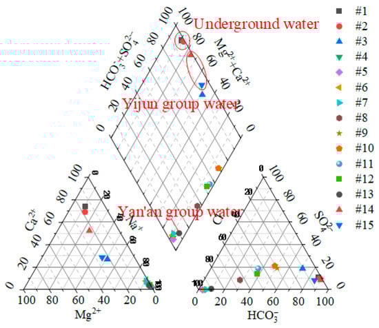 Due to the existence of multi-layer aquifers in the overlying rocks of the working face, in order to determine the water source of the water breakout in the working face and the key aquifer that led to the pressurized rack accident, we tested the water quality using on-site measurements, sample collection, and other methods. During the occurrence of the first water surge pressurized racking accident in the 1309 working face, water quality testing was carried out, respectively, on the roof water of the roof slab surge, the roof water of the relief holes and aquifers, and the surface water, and the test results are shown in Table 2, and according to the results of the water quality testing, the water quality Piper diagram shown in Figure 2 was drawn. In the process of deep hole drilling, the optimization of the damper structure design based on the dry friction effect can effectively improve the damping performance [,], inhibit the vibration of drilling tools, further optimize the drilling efficiency, and avoid the risk of overloading [].