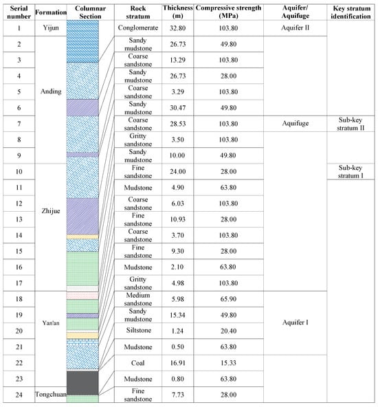 The parameters of the overlying strata above the working face are illustrated in Figure 3. Based on the key stratum identification method [], two sub-key strata exist within the 231.54 m vertical span between the working face and Aquifer II: