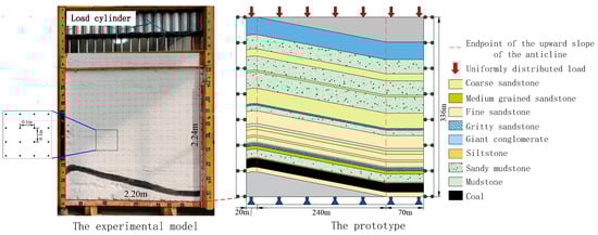 A physically similar material model was built with the geological conditions of the 1309 working face in the Guojiahe Coal Mine as a prototype, as shown in Figure 4. A plane stress model frame with a model size of 2.2 m × 0.3 m × 2.24 m (length × width × height) was used for the experiment, and the simulation object was the 336 m rock stratum from the direct bottom of the working face to the upper part of the working face, with a horizontal length of 330 m, which included a 70 m horizontal coal seam, 240 m inclined coal seam (elevation angle of 11°), and 20 m backslope axial part. The geometrical similarity ratio and bulk weight similarity of the simulation experiment are 150 and 1.67, respectively, and according to the similarity theory [,], the model motion time similarity ratio, stress similarity ratio, and mass similarity ratio can be determined to be 12.25, 250, and 5.64 × 106, respectively.