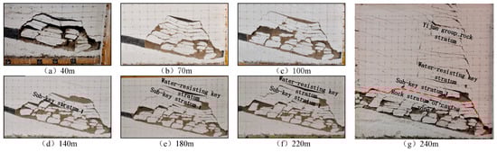 Based on the monitoring results of the high-definition camera on the roof overburden, Vic-2D software is used to obtain the displacement magnitude of the digital point cloud on the surface of the model before each excavation, which, in turn, can be inverted to obtain the evolution law of the displacement field of the roof overburden in the process of advancing of the working face. The displacement maps of the rock layer of the seven times of breaking the rock overlaying the working face are shown in Figure 5a–g, respectively. When the working face advances to 40 m, the overburden rock of the Yan’an group collapses, and the height of the collapse zone is 23.06 m; when the working face advances to 70 m, the rock layer of the intuition group in the lower part of sub-critical layer Ⅰ collapses, and the height of the collapse zone increases to 65 m. As the step distance of rock layer collapse of the intuition group is larger than that of the Yan’an group, the collapse of two rock layers is not synchronized, and the rock layer collapse of intuition group generally lags behind that of the Yan’an group. When the working face advances to 100 m, the rock layer of the Yan’an group collapses for the third time, while the intuition group does not collapse; when the working face advances to 140 m, the rock layer of the intuition group collapses for the second time, while the rock layer of the Yan’an group has collapsed four times. When the face advances to 180, sub-critical layer Ⅰ breaks, the height of the water-conducting fissure zone develops to 100.5 m, and the rock layers of Yan’an group and the intuition group collapse for the fifth and third times, respectively, at this stage. When the working face advances to 240 m, the water-isolating key layer breaks, and the upper 100.51 m of the rock layer is synchronously fractured and activated, with significant changes in the middle–upper displacement field of the model, and the water-conducting fissure zone develops into the Yijun Formation aquifer, with a height of more than 229.54 m.