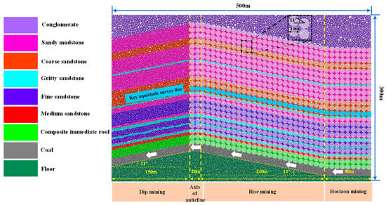 A numerical model was established in PFC 2D 5.0, comprising four mining configurations: horizontal mining, rise mining, anticlinal axis mining, and downdip mining (dimensions: 500 m × 300 m). The stratigraphic model was constructed based on the coal-rock parameters shown in Figure 2. The immediate roof above the coal seam was integrated and designated as a composite immediate roof due to its relatively thin strata. The immediate floor consists of 0.8 m mudstone combined with fine-grained sandstone, collectively termed as the floor. Anticlinal parameters for each stratum are shown in Figure 7. The parallel bond model was adopted for particle–particle contacts, while the linear model was used for particle–wall interactions. Measurement circles were arranged from the coal seam roof to the conglomerate layer, covering both horizontal and rise mining sections, with the critical aquiclude monitoring line indicated in blue in Figure 7. The model was calculated to equilibrium [], with the physical–mechanical parameters of coal and rocks listed in Table 3.