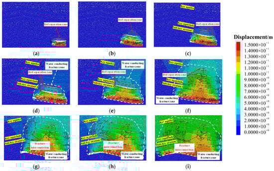 Distribution characteristics of overburden rocks under different mining stages: (a) 40 m, (b) 100 m, (c) 140 m, (d) 180 m, (e) 220 m, (f) 240 m, (g) 260 m, (h) 320 m, and (i) 340 m.