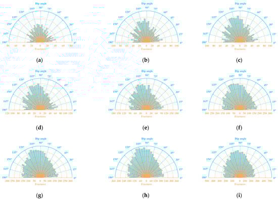 Distribution characteristics of angular intervals of mining overburden fissures: (a) 40 m, (b) 100 m, (c) 140 m, (d) 180 m, (e) 220 m, (f) 240 m, (g) 260 m, (h) 320 m, and (i) 340 m.