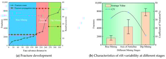 The number of overburden fissures in the above mining process was counted, and the mining stage was also divided, in which 0~180 m is the upward mining stage, 180 m~260 m is the backslope axis, and 260 m~340 m is the downward mining stage, and the results are shown in Figure 10. Overall, the fracture count is proportional to the advance distance, but the fracture development rates differ among various rock strata failures: