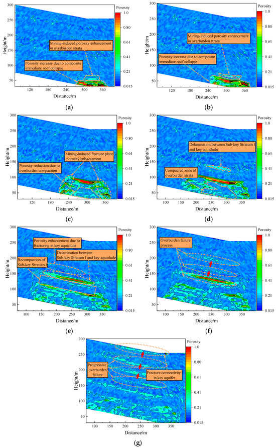 Porosity distribution characteristics of overburden rock under different mining stages: (a) 40 m, (b) 60 m, (c) 100 m, (d) 140 m, (e) 180 m, (f) 220 m, and (g) 240 m. (The red arrow indicates the direction of transmission of mining impact.)