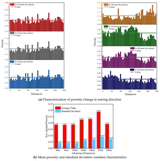 (4) When the working face was pushed to 220 m, the value of the key water barrier and the lower rock layer gradually converged to the limit of the collapse step, and at the same time, under the influence of the high tensile stress of the backslope axis, the fissures inside the rock layer were constantly developing, penetrating, and expanding, which led to the increase of porosity in the key water-bearing layer. and The porosity of the rock layer in the backing distance of 0~160 m was generally higher than that of other advancing stages, as seen in the figure, and at this time, the average porosity of the rock layer was 0.289, which is the highest value among all advancing stages, and the standard deviation of 0.092 also reaches the maximum value, indicating that the fissure development near the axis of the backslope has high spatial non-homogeneity characteristics.