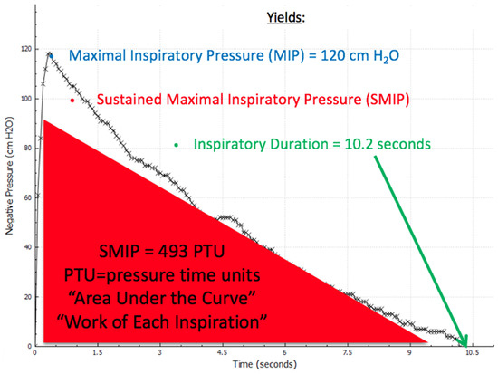 The MIP, as shown in Figure 1, indicates the highest pressure generated by an individual during the first second of an inspiratory breath [5]. This metric captures the peak strength of the inspiratory muscles. In contrast, the SMIP quantifies the cumulative pressure produced over the entire duration of a sustained inhalation, providing insights into the strength, endurance, and work capacity of these muscles during a single breath [5]. In Figure 1, MIP is represented by the initial peak of the inspiratory breath, while SMIP is depicted as the area under the pressure curve, highlighted in red.