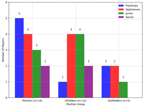 The grouped bar plot (Figure 2) displays the count of each academic year (freshman, sophomore, junior, senior) for each position group (pitchers, infielders, outfielders) for comparison across positions.