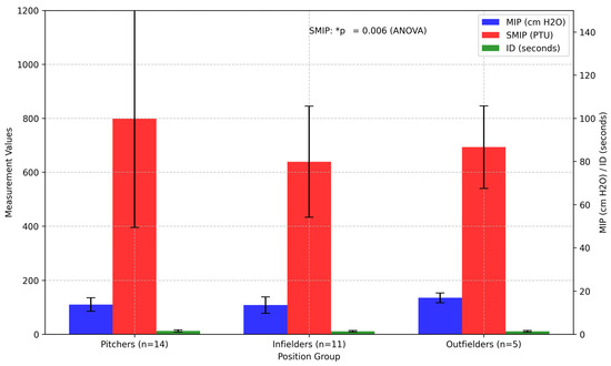 Inspiratory performance across three position groups can be found in Table 3. Outfielders exhibited the highest mean maximal inspiratory pressure (135 ± 18 cm H2O) and a moderate SMIP (693 ± 153 PTU), while pitchers had the highest mean SMIP (798 ± 403 PTU) and longest inspiratory duration (12.4 ± 4.2 s), with infielders showing the lowest values across all measures (MIP: 108 ± 30 cm H2O, SMIP: 639 ± 206 PTU, inspiratory duration [ID]: 11.1 ± 2.6 s).