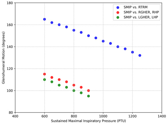 Negative correlations between SMIP and glenohumeral motion in pitchers. This scatter plot illustrates the negative correlations between SMIP and glenohumeral motion metrics (RTRM, RGHER, LGHER) for pitchers, as reported: RTRM (r = −0.56), LGHER (r = −0.82 for LHP), and RGHER (r = −0.88 for RHP).