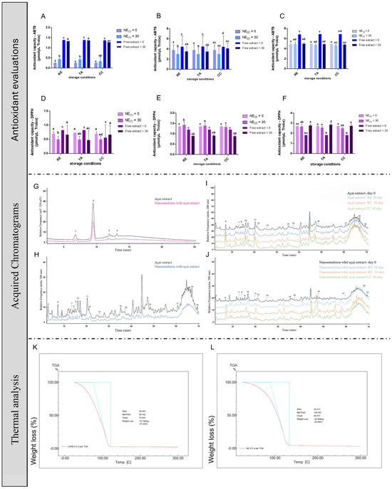 Antioxidant capacity of açaí-free extract and NEs and stability. The antioxidant capacity of açaí-free extract and NE storage in different conditions using DPPH· and ABTS+· methods. (A) ABTS+· for NE1. (B) ABTS+· for NE2. (C) ABTS+· for NE3. (D) DPPH· for NE1. (E) DPPH· for NE2. (F) DPPH· for NE3. (G,H) HPLC curves for açaí-free extract and NEs. (I) HPLC for açaí-free extract in different temperature conditions. (J) HPLC for NEs in different temperature conditions. (K) Thermal analysis for açaí-free extract. Peak 1: Cyanidin-3-O-glucoside; Peak 2: Cyanidin-3-O-rutinoside; Peak 3: Peonidin-3-O-glucoside; Peak 4: Peonidin-3-O-rutinoside; Peak 5: Gallic acid; Peak 6: Protocatechuic acid; Peak 7: Epigallocatechin; Peak 8: Catechin; Peak 9: Caffeic acid; Peak 10: Vanilic acid; Peak 11:Epicatechin; Peak 12: Syringic acid; Peak 13: p-Coumaric acid; Peak 14: t-Ferulic acid; Peak 15: Dihydroquercetin; Peak 16: Orienthin; Peak 17: t-Cinnamic acid; Peak 18: Luteolin; Peak 19: Apigenin and (L) Thermal analysis of NEs. Statistical analysis was performed via one-way ANOVA, followed by Tukey’s post hoc test. Results with p < 0.05 were considered significant. Different letters indicate statistical differences between groups.