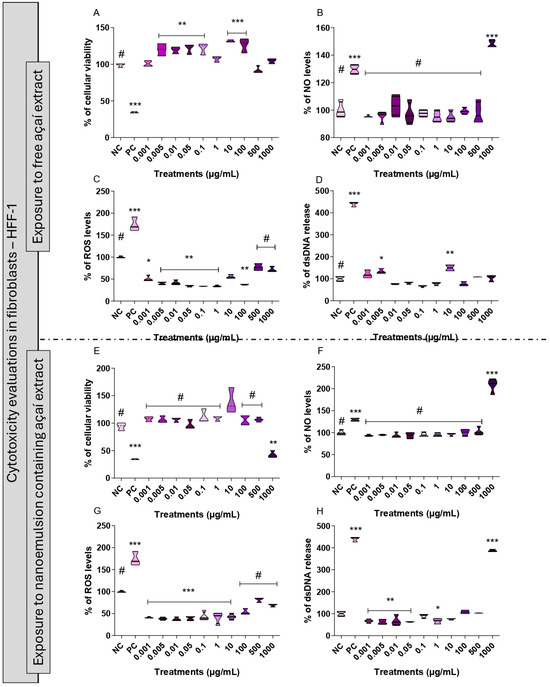 Human fibroblasts (HFF-1 cell line, ATCC SCRC-1041) were purchased from the Rio de Janeiro Cell Bank. These cells were cultured using Dulbecco’s Modified Eagle Medium (DMEM) with 10% of fetal bovine serum (FBS) and 1% of antibiotics (penicillin and streptomycin). The cells were kept in a CO2 incubator at 5% CO2 and 37 °C. Then, the fibroblasts were exposed to a concentration–response curve (0.001–1000 μg/mL) of the açaí-free extract and of the NEs during 24 h. After the incubations, colorimetric and fluorimetric assays were performed to evaluate cellular viability and proliferation as well as parameters related to the oxidative metabolism. The negative control group was composed of cells with cell culture medium only. The following were used for the positive controls: (i) 25 μM of hydrogen peroxide (H2O2) for the viability analysis, the semi-quantification of ROS, and the determination of dsDNA release assays; (ii) 10 μM of sodium nitroprusside for the NO quantification test.