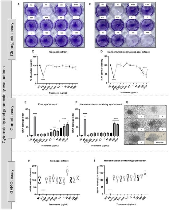 Figure 3E,F show the comet assay results. Interestingly, from 0.1 to 1000 μg/mL of the açaí-free extract the cells presented an increased DNA damage index in comparison to the untreated cells. On the other hand, considering the nanoemulsion containing açaí extract, only the concentrations of 500 and 1000 μg/mL caused potential DNA damage compared with the negative control. Figure 3H,I demonstrate the obtained results for the GEMO assay. None of the tested concentrations of free or nanostructured açaí extract caused DNA breaks directly in comparison to the negative control.