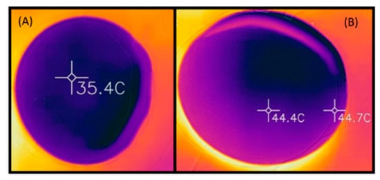 Baseline examination of the silicone-gel implants’ time to heat from baseline (A) to a temperature simulating sun exposure (B).