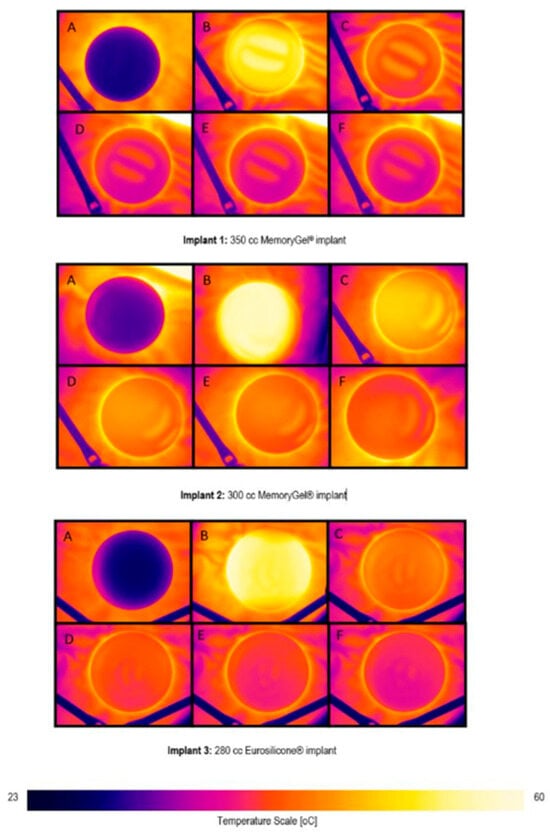 The thermal images indicate the temperature of an area by its color. The brighter the area, the higher the temperature in it as compared to its surroundings. In keeping with this, the darker the area, the lower the temperature in that area is compared to its surroundings. Figure 6 illustrates this thermodynamic feature; the silicone-gel implants in thermal image A of each figure are the darkest, indicating that they have the lowest temperature. On the contrary, the silicone-gel implants in thermal image B of each figure are the brightest, indicating that they have the highest temperature. Lastly, images C, D, E, and F visualize the implants gradually becoming less bright, corresponding to the implants cooling over time. Notably, each implant has a slight defect, evident in the thermal images.