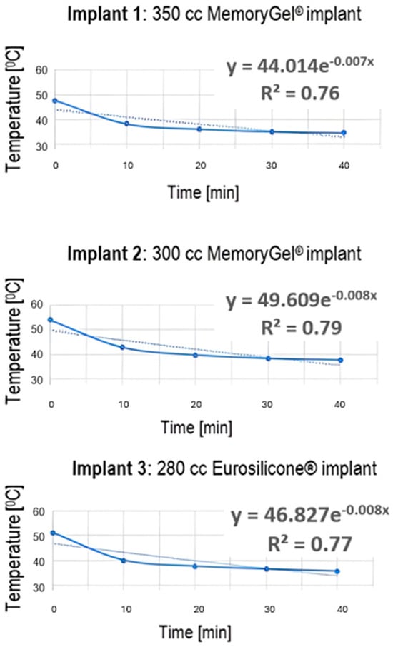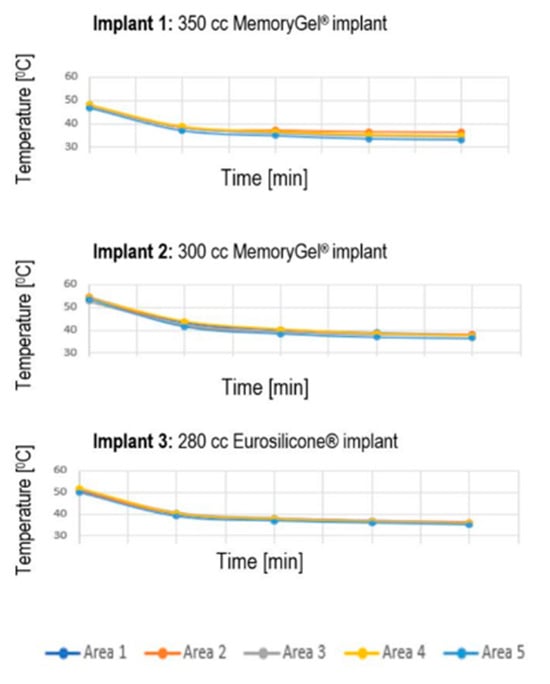Figure 8 summarizes the mean cooling process temperatures for each area of the silicone-gel implants. Notably, the highest temperature was obtained immediately upon removing the external heating, and it remained greater than 30 °C in all cases, which was still higher than the initial temperatures listed in Table 2.