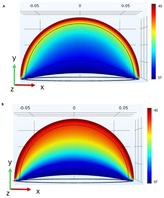 Regarding boundary conditions, the temperature at the bottom of the model was set to 37 °C, simulating the body’s internal temperature (Figure 4A). The temperature on the outer surface of the skin was set to 40 °C to simulate external heating of the skin (Figure 4B). The skin surface convective boundary condition is depicted by Equation (3), where h = 10 W/K k = 0.235 W/Km, and T∞ = T0 = 21 °C.