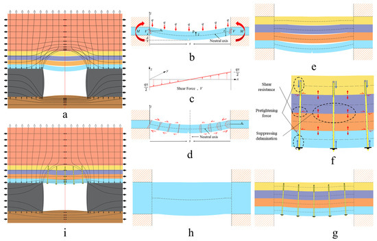 Roof support principle. (a) Stress transfer under roof separation conditions; (b) Force analysis of rock beam; (c) Shear force of rock beam; (d) Secondary stress in beam; (e) Separation dividing into multi-layer rock beam; (f) Anchoring effect; (g) Anchoring combined with multi-layer rock beam; (h) Thick-layer anchored rock beam; (i) Stress transfer under roof separation elimination conditions.