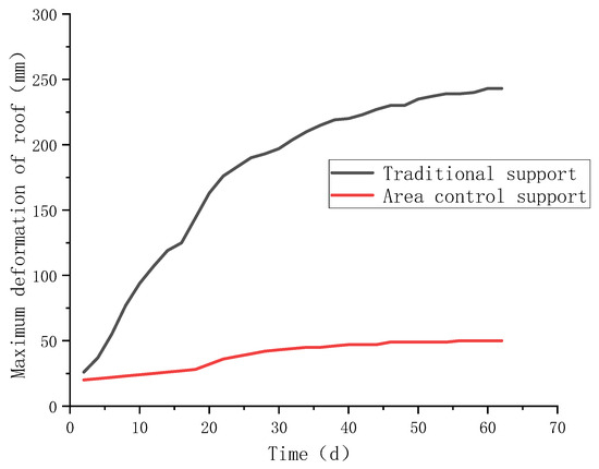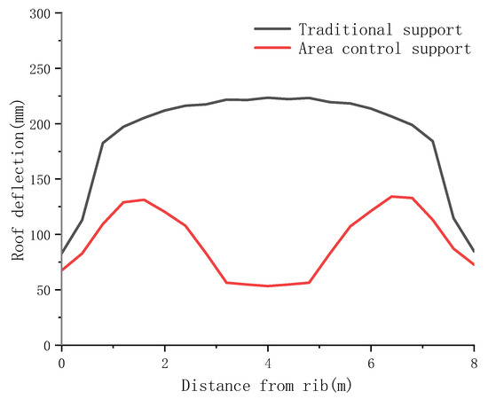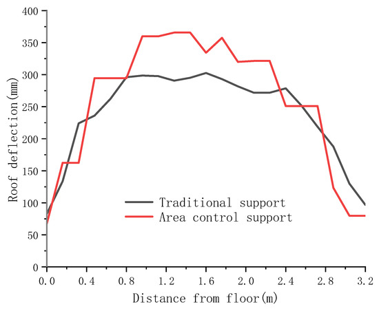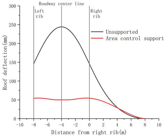 Substituting the required parameters into Equations (18) and (19) can draw a comparison diagram of roof deflection between unsupported and area control support, as shown in Figure 4.