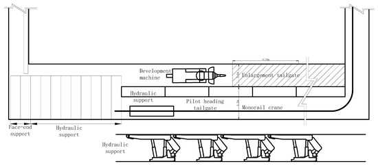 The core of the “1 + 2” integrated excavation and support method lies in using hydraulic supports arranged parallel to the strike to reinforce the large-span tailgate roof, achieving safe and efficient installation through parallel enlargement and support operations. The number “1” refers to installing 1 row of hydraulic supports parallel to the strike along the enlargement side within the tailgate to reinforce the roof, serving as the first support to be rotated and installed in each cycle; “2” refers to supplementally installing 2 hydraulic supports after the first support in each cycle is rotated into the face-advance direction.