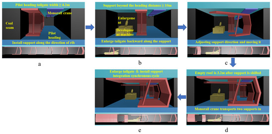 Construction sequence: Excavate tailgate → Assemble supports → Transport complete supports → Install hydraulic supports within the tailgate → Enlarge tailgate → Adjust strike-parallel hydraulic supports to face-advance direction → Supplementally install 2 face-advance hydraulic supports → Cycle through enlargement and installation until completion. Steps for integrated tailgate enlargement and support installation are shown in Figure 6, The alphabetical order in the figure is the sequence of steps.