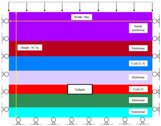 Based on the actual geological conditions of the tailgate of Panel II513 at Huaibei Shuanglong Coal Mine, a UDEC model was designed with dimensions of 50 × 36.7 m. As shown in Figure 7, the model is divided into seven layers, from top to bottom: sandy mudstone, mudstone, coal (Seam 3/4), mudstone, coal (Seam 5), mudstone, and sandstone. Horizontal displacement is restricted on the left and right sides of the model, and vertical displacement is zero at the bottom. A vertical load of 7.5 MPa is applied to the upper boundary to simulate overburden load, with a lateral pressure coefficient of 1.0. The Mohr–Coulomb model is used. Mechanical parameters for strata and joints are listed in Table 1.