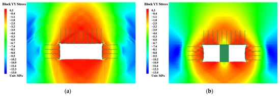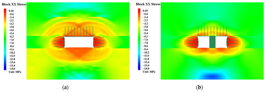As shown in Figure 8, compared to conventional bolt-cable support, the vertical stress relief zone under area control support is significantly reduced, but the stress concentration in the ribs is more pronounced. Under the support action of hydraulic supports on the tailgate roof, continuous stress transfer occurs in the supported roof-floor region. Continuous stress transfer in the roof and the reduction of the stress relief zone promote continuous displacement between deep and shallow roof strata, eliminate roof delamination, and effectively maintain roof stability. Acting as a medium, the hydraulic supports directly transfer roof load to the floor, functioning similarly to a coal pillar or backfill, dividing the original large-span tailgate into two small-span roadways. The “span reduction” effect is evident. Continuous stress transfer in the supported area divides the stress relief zone into two smaller parts.