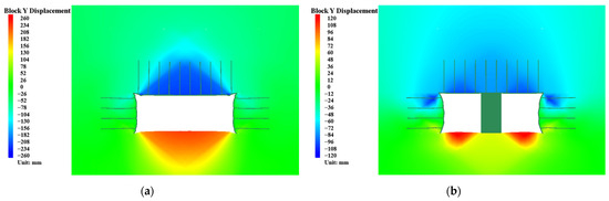 Vertical displacement distribution contour under different support forms: (a) conventional bolt-cable support; (b) area control support.